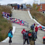 Ainsi, plus de 45 centres de femmes membres de L’R des centres de femmes du Québec, répartis dans les 17 régions de la province ont entrepris, il y a plus d’un an, d’utiliser le tricot-graffiti pour se rendre visibles lors de la Marche mondiale 2015 en se réappropriant ainsi le territoire. Ces œuvres témoignent de la diversité des femmes qui fréquentent les centres de femmes du Québec, des initiatives locales créées et gérées par et pour les femmes de leur milieu, et démontrent qu’elles sont tricotées serrées partout à travers le Québec. Leur confection représente plus d’un an de travail et a impliqué des milliers de femmes. Face à l’austérité qui affaiblit les mailles de notre tissu social, les centres de femmes tissent des solidarités et se mettent en action pour leur émancipation individuelle et collective.