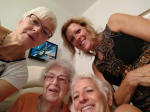 Que de pleurs avons-nous versés en racontant les difficultés vécues avec nos maris, nos séparations et divorces! Que de débarbouillettes d’eau froide avons-nous réclamées pour calmer nos bouffées de chaleur! Que de sujets épineux avons-nous abordés – avortement, viol, contraception, homosexualité – menant à des discussions parfois houleuses, toujours respectueuses. Que de confidences de maman sur sa vie de jeune fille, les contraintes de l’époque si différentes de ce que nous, les plus vieilles des sœurs avons connu, et que mes jeunes sœurs ne vivront jamais. Que de rires libérateurs à regarder d’anciennes photos, à danser avec un linge à vaisselle sur la tête, à se remémorer d’heureux souvenirs.